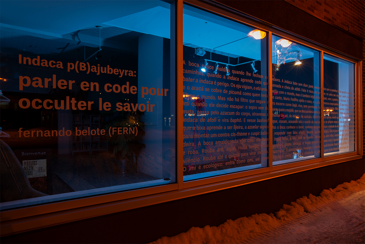 Pour FERN, le Bajubá fait partie d’une mémoire intime du Brésil: une langue apprise dans la rue comme stratégie pour affronter la violence domestique, façonnée au cœur même des communautés périphériques où iel a grandi. Cette installation prend forme à la suite d’une résidence à l’Écart, où FERN a étudié les implications du P(B)ajubá dans les communautés LGBTQIAPN+ brésiliennes, en explorant des travaux académiques sur la queérisation du langage et en reliant cette recherche au carnaval brésilien et à ses formes de résistance. Ce processus l’a également conduit·e à mener et revisiter des entretiens avec Jovanna Baby, Neon Cunha, Daniela Andrade, Mikaella Belicoff, Kabila Aruanda, Ranella Macedo et d’autres, dans une quête de sources primaires pour inspirer et redéfinir son travail.