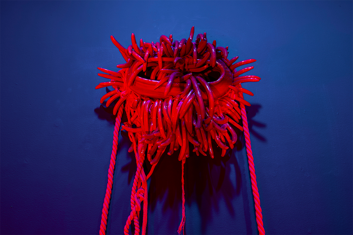 Pour son exposition à l’Écart, fernando belote (FERN) présente une installation indisciplinée, basée en céramique et en lettrage, qui défie les normes coloniales du corps et de la représentation. Au centre de l’espace, une sculpture de bouche carnavalesque — ouverte, affûtée, presque incantatoire — agit comme un symbole de transformation. Elle renvoie à un vocabulaire tranchant, un ensemble de signes qui queerise et décolonise l’imaginaire lusophone, fragmentant la syntaxe portugaise en démarches de résistance queer. Cette bouche devient l’emblème visuel d’un geste linguistique: honorer le Bajubá.